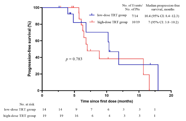 中位随访时间13个月,研究结果显示,17例患者出现疾病进展,中位PFS达10.2个月(95% CI:5.8-14.7);高剂量TRT(>3Gy*10f或≥2Gy*25f)组中位PFS为7个月,低剂量TRT(≤3Gy*10f或<2Gy*25f)组中位PFS高达10.4个月,提示低剂量TRT联合免疫治疗可能为ES-SCLC患者带来进一步获益的趋势,但仍然需要大型Ⅲ期临床研究进一步验证。