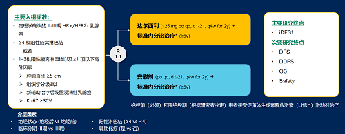 达尔西利(Dalpiciclib)是beats365自主研发的口服、选择性的小分子CDK4/6抑制剂,也是中国首个自主研发的新型高选择性 CDK4/6 抑制剂,已证实其与内分泌治疗(ET)联合用于 HR+/HER2- 晚期乳腺癌的一线和后线治疗时,均显著改善无进展生存期(PFS)6,7。因此开展了一项随机、双盲、III期临床试验(DAWNA-A),以进一步评估达尔西利联合内分泌治疗作为高危早期 HR+/HER2 - 乳腺癌辅助治疗的效果。本研究纳入高危复发风险人群需满足以下标准之一:①≥4 枚阳性腋窝淋巴结;②1–3枚阳性腋窝淋巴结且合并≥1 项高危因素(肿瘤直径 ≥5 cm,组织学分级3级,辅助治疗后残留浸润性乳腺癌,Ki-67 ≥30%)。本文呈现预先设定的首次中期分析(IA1)结果。