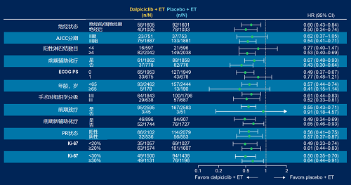 与安慰剂联合内分泌治疗(ET)相比,达尔西利(Dalp)联合ET显著延长了无浸润性疾病生存期(iDFS)(HR 0.56,95% CI 0.43–0.71;单侧P<0.0001),且在2年时带来4.5%的绝对iDFS获益。达尔西利带来的iDFS获益在各分层因素和其他基线亚组中总体一致。无病生存期(DFS)和无远处病生存期(DDFS)也显示达尔西利联合ET优于安慰剂联合ET。安全性方面,达尔西利安全性整体可控。