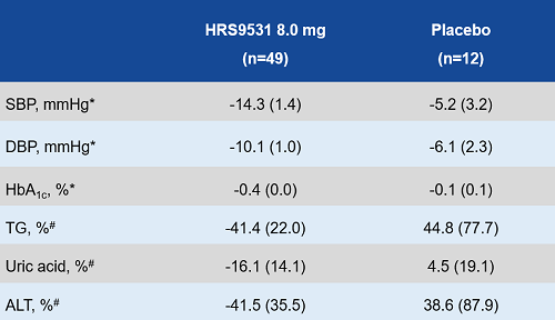 第36周血压和其他生化指标较基线变化情况:与安慰剂组相比,HRS9531注射液8 mg显著改善血压和血糖控制,并降低甘油三酯、尿酸及丙氨酸氨基转移酶水平。